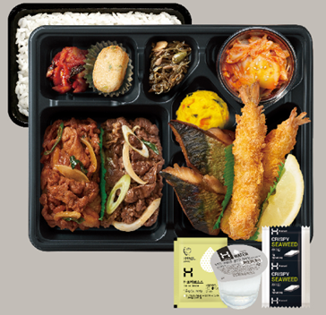 12가지 다양한 반찬과 조미김, 미니생수가 함께 구성된 프리미엄 도시락으로 소불고기, 제육볶음, 새우후라이, 짭쪼름한 맛이 일품인 고등어 데리야끼 2조각이 구성된 든든한 도시락(※점포 식재 상황에 따라 연어(1조각) 또는 고등어(2조각)로 제공됩니다)