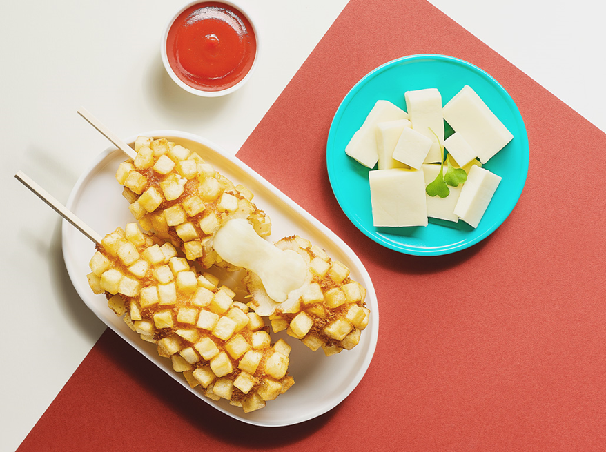 100% 모짜렐라치즈에 고소하고 바삭한 감자가 어우러져 고급스러움을 더한 핫도그